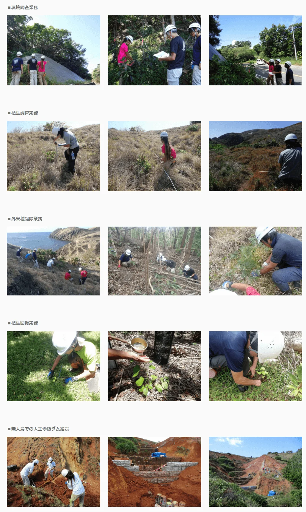 環境保全事業も主軸を為す事業戦略の一つで「小笠原独自の植生」やそれを支える「土壌基盤」を中心に知見と技術力を高めてきました。中でも小笠原諸島の有人無人島の植生回復事業には四半世紀に渡って関わらせていただいており、それら経験値を基に「調査設計」から「施工」、「モニタリング等、維持管理」までワンストップで生態系保全を担える組織体制を構築しています。